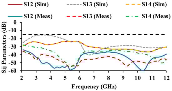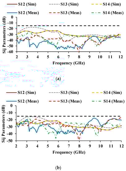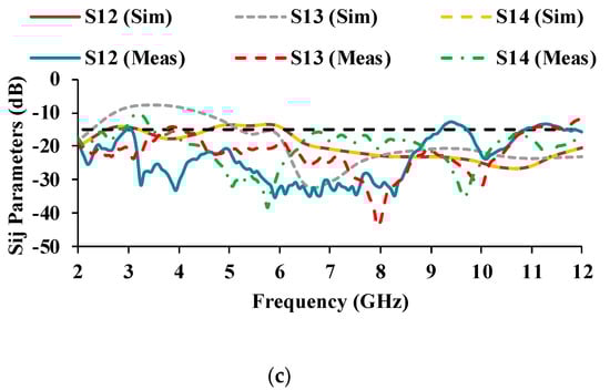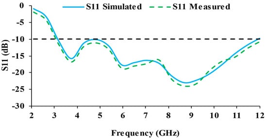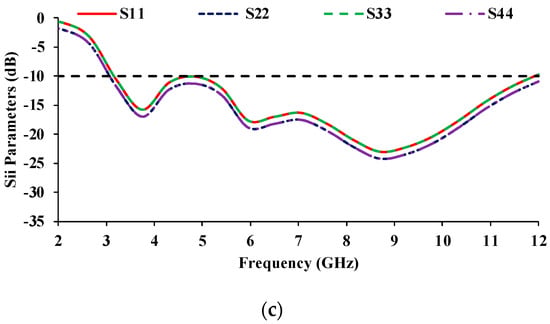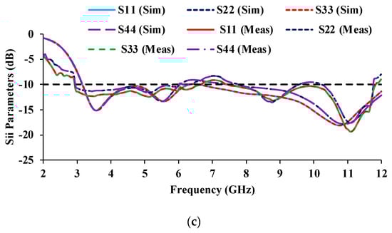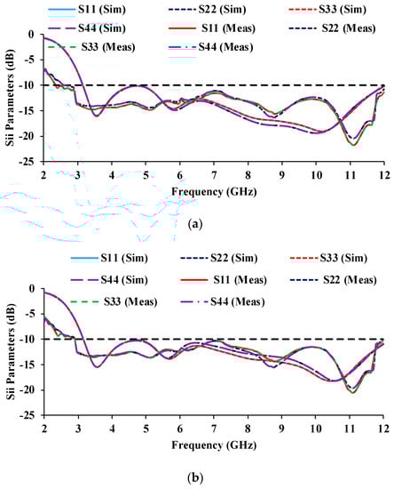 The simulated and measured scattering parameter results are displayed in Figure 10 and Figure 11. It can be noticed that the reflection coefficients of Antenna-1 and Antenna-3 are identical, and the reflection coefficients of Antenna-2 and Antenna-4 are also matching, which is due to the orthogonal placement of the unit cells. The simulated S-parameter has an impedance bandwidth of 8.9 GHz (3.1–12 GHz), while the measured S-parameter has an impedance bandwidth of 9.08 GHz (2.2–11.28 GHz). The simulated and measured results both cover the entire UWB range.