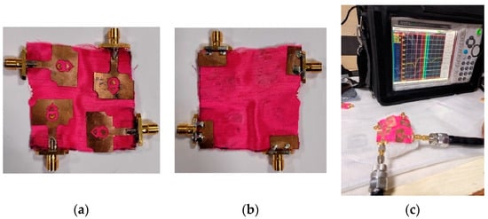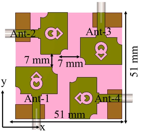 The developed MIMO antenna layout is displayed in Figure 8, where four-unit cells are duplicated and arranged in an orthogonal pattern. The spacing between the antenna elements is kept as 0.97. The MIMO antenna occupies a volume of 51 mm × 51 mm × 1.5 mm (0.52 × 0.52 × 0.015), where is the wavelength corresponding to the lowest operating frequency. The prototype is fabricated on the polyester substrate, as depicted in Figure 9, and the S-parameter results are measured using Anritsu MS203C Vector Network Analyzer (VNA).