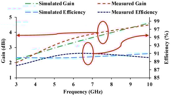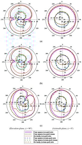 Figure 12 presents the simulated and measured gain and efficiency plots of the MIMO antenna. The simulated gain at 3 GHz, 6 GHz, and 10 GHz is 2.2 dBi, 3.32 dBi, and 4.82 dBi, respectively. Whereas, the measured gain values are 2 dBi, 4 dBi, and 4.7 dBi at 3 GHz, 6 GHz, and 10 GHz, respectively. The proposed antenna has a maximum efficiency of 92%. The radiation patterns can be seen in E-plane (elevation plane) and H-plane (azimuth plane) as depicted in Figure 13. When the polarization of the proposed antenna and the reference (Horn) antenna are the same, the co-polarization pattern is depicted. When the polarization of the antennas differs, a cross-polarization pattern is observed. The simulation results are plotted for the free-space and on-body conditions. The designed antenna is fabricated and measured in free space. When compared to the free space results, the on-body radiation patterns are suppressed due to the effects of the human body.