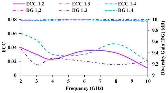 The DG illustrates how well a signal is conveyed while experiencing the least amount of data loss [], which is based on the ECC value and can be obtained by using Equation (8). The DG should be >9 dB. As ECC values decrease, the resulting DG becomes more contrasting. The ECC and DG of the proposed antenna are satisfactory.
