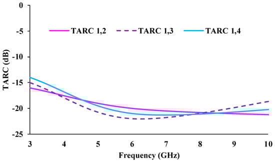 Channel losses will occur during the correlation of diversity performance. The channel losses can be estimated through the total active reflection coefficient (TARC), which can be calculated using Equation (9) []. TARC is the ratio of the square root of the sum of total reflected waves ( to the square root of the sum of total incident waves (.