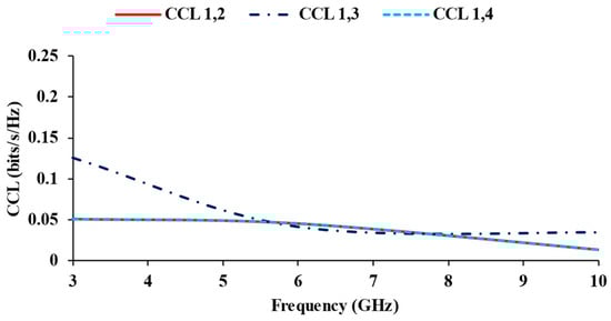 TARC should be less than −10 dB. Transmission loss is defined as channel capacity loss (CCL) in high data rate transmission [,], which is evaluated using Equation (11). The CCL value should not be higher than 0.4 bits/s/Hz. The calculated TARC and CCL results of the designed antenna are plotted in Figure 15 and Figure 16.