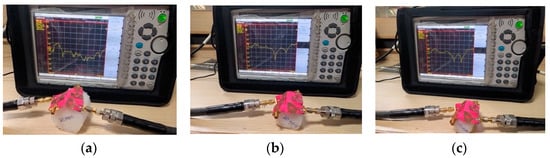 Reflection coefficients of the antenna at three bending radii (a) BR = 25 mm, (b) BR = 20 mm, (c) BR = 15 mm.