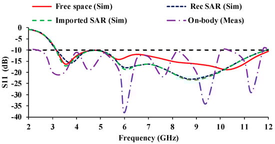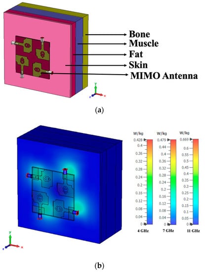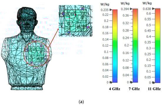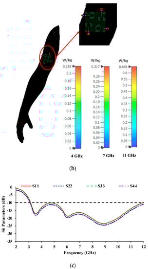 The SAR analysis is also carried out by importing human body models from the open-source computer-aided designing (CAD) model []. The proposed MIMO antenna is simulated by placing it to the chest and forearm of the human body model. The SAR values of the MIMO antenna located on the chest and forearm are depicted in Figure 22a,b. The corresponding S-parameter curves of the MIMO antenna are plotted in Figure 22c, which shows an impedance bandwidth of 9 GHz (3–12 GHz).