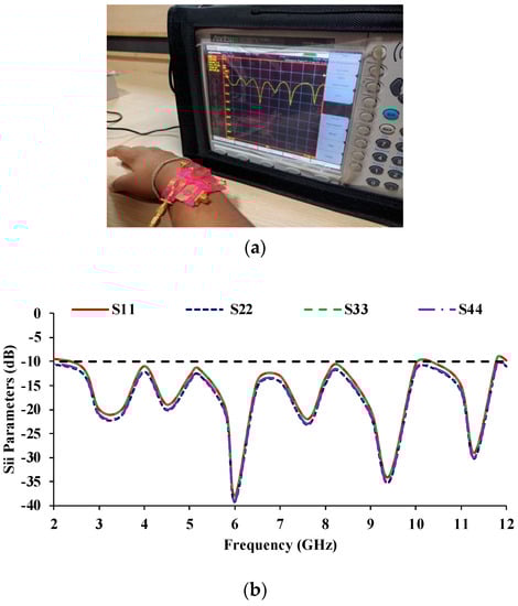 The on-body performance of the proposed MIMO antenna is evaluated by placing it on a human body and measuring it with a vector network analyzer (VNA), shown in Figure 23a. Figure 23b depicts the measured reflection coefficients of the proposed MIMO antenna when it is placed on the human body. It covers the entire UWB with an impedance bandwidth of 9.2 GHz (2.6–11.8 GHz), making it suitable for wearable and bio-healthcare applications.