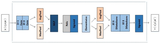 In this paper, we replace the 7 × 7 large convolution kernel in the spatial attention module with two 3 × 3 dilated convolutions with a dilated rate of 2, reducing the number of parameters in the spatial attention module. The modified CBAM model is shown in Figure 4, where X and Y represent the input and output feature matrices, respectively, and C, W, and H and Cl, Wl, and Hl represent the three-dimensional information of X and Y, respectively.