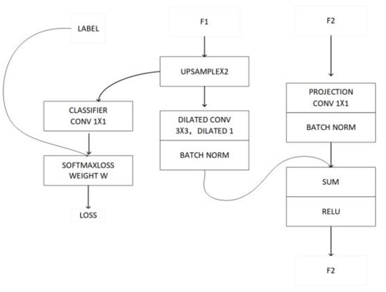 The CFF module has three inputs, the feature maps F1, F2, and label. For F1, it is upsampled twice to make it the same size as F2, and then the features of F1 are refined by convolution with a hole of size 3 × 3 and a dilation rate of 2. For F2, it is convolved by 1 × 1 to make it the same number of channels as F1, and then the features are normalized using the BN layer. This is then added to the F1 features obtained above to obtain F2′. To enhance the learning of feature F1, the upsampled features of 1 are guided using an auxiliary label, optimizing the loss. Where, for the first CFF module, F1 and F2 are the features obtained from the low- and medium-resolution branches, respectively.
