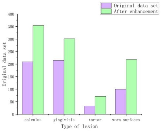 To expand the difference between the samples and ensure the generalization ability of the later model training, randomly crop the collected dental lesion pictures and restore the original size and flip it over, then adjust the contrast, brightness, saturation, etc. Then, the original tooth lesion image is scaled to 512 × 512 pixels according to the principle of proportional invariance, the distorted image is removed by manual screening, and 400 dental lesion images are selected as the original dataset. Figure 7 shows that dataset example and Figure 8 shows that the number of various lesions before and after data augmentation. Finally, the Label Me labeling tool was used to imitate the PASCAL VOC2012 dataset format to manually label the four categories of calculus, gingivitis, tartar, and wear surface in the lesion image and the dataset was divided into a training set, validation set, and test set at a ratio of 7:2:1.
