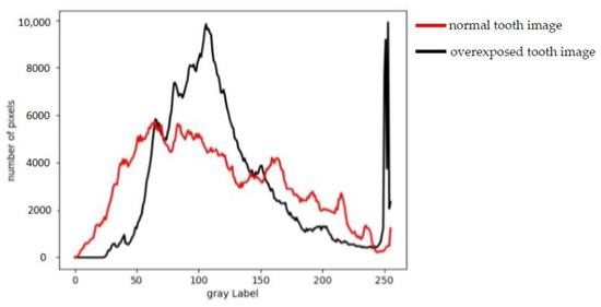 In addition, the tooth lesion dataset was overexposed, resulting in unclear edges and unclear details in the lesion image. The histogram of the normal tooth image is more balanced, while the overexposed tooth image has too many pixels with high brightness, which causes the histogram to shift to the right, as show in Figure 9.