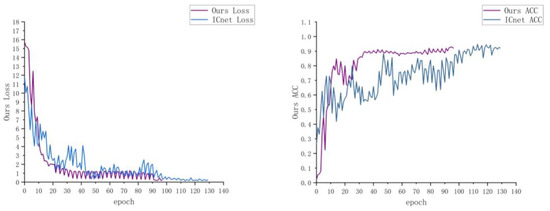 In terms of real-time segmentation, ENet, UNet, SegNet, ICNet, and the improved ICNet took 833 ms, 696 ms, 739 ms, 805 ms, 307 ms, and 395 ms for a single image, respectively. Compared with ENet, U-Net, and SegNet, the improved ICNet shortens the time by 34.63%, 38.43%, and 43.47%, respectively, and shortens the time by nearly half compared with FCN and increases less time compared with ICNet. From Table 3, we can see that the improved ICNet is slightly more computationally expensive than ICNet.