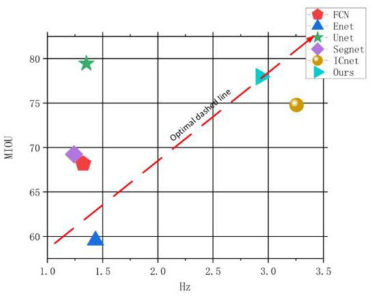 From the above evaluation indicators, it can be seen that our method has the best segmentation effect, and when the segmentation time is close to ICNet, the three indicators of our method have improved to varying degrees. The indicators have improved to varying degrees. Among the visualization results of all methods, our segmentation effect is the closest to the real label. The abscissa of Figure 12 is the frequency of division, the ordinate is MIOU, and the upper-right corner of the figure is the optimal method. Figure 12 shows that our method is optimal in terms of accuracy and time.