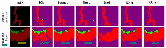 Among the four types of lesions, dental calculus and wear surface are the most similar to normal tooth tissue characteristics. Figure 13 shows the segmentation visualization results of dental calculus and wear surface by our method and other algorithms. FCN, U-Net, and SegNet oversegment for calculus. ENet and ICNet have certain undersegmentation problems. The visualization effect of our method is closest to the label. Among the visualization results of wear surface segmentation, ENet segmentation has the worst effect, the segmentation results of the other algorithms are not much different, and the results are relatively close.