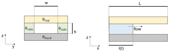 where ϴ denotes the contact angle of the different materials employed and γ the surface tension. According to Equation (8), when w << h, the capillary pressure gradient depends only on w and the microchannel can even be left open [39,40]. Under the assumption of laminar, steady-state flow, and in the absence of gravitational effects, the position of the advancing liquid l(t) can be obtained by manipulating Equations (6–8) [34,41]:
