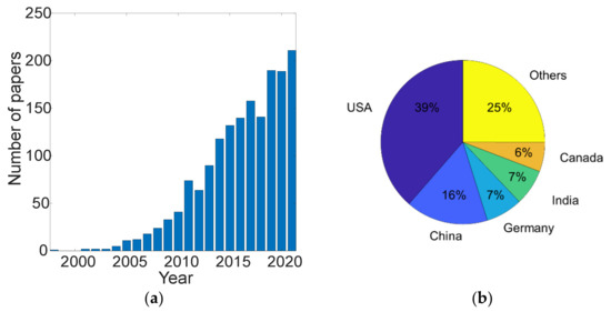 This paper provides an overview of the most recent efforts to integrate microfluidics and electronics into a portable system. Integrating microfluidics into POC devices is an ever-growing trend and many different approaches have been demonstrated thus far. According to the Web of Science [107], at present there are more than 1700 papers linked to the keywords “microfluidics” and “point-of-care”. Although the first work listed dates back to 1998 [108], more than one third of these works have been published since 2019 (see Figure 4a). The top five publishing institutions for the papers analysed on the Web of Science are: the University of California (4.915%), the Chinese academy of science (3.043%), Harvard University (2.984%), Duke University (2.984%), Stanford University (2.458%). However, 38.151% of the listed paper were published by American institutions. China and Germany follow with 16.384% and 7.197%, respectively (see Figure 4b). Resulting works are typically published from top publishers, including Elsevier (19.661%), Springer Nature (12.463%), IEEE (10.006%) and MDPI (9.421%). The top five funding agencies for the listed works are: the United States Department of Health Human Services (13.283%), the National Institutes of Health (NIH) USA (13.107%), the National Natural Science Foundation of China (NSFC) (10.532%), the National Science Foundation (NSF) (10.181%), and the European Commission (6.671%). The high volume of interest in the field is justified by the high societal and economic impacts of POC technology. As microfluidic POC devices became pervasive in our society, there are some challenges that need to be highlighted and addressed. One major concern about this technology remains the accuracy and LOD. Although there are POC platforms with LOD of micromolar fractions [71], efforts are needed to deliver reliable devices capable of high accuracy and extremely low LOD in a real-world scenario. Another main concern about this technology is in regard to materials. Most of the microfluidics devices developed thus far involve the use of PDMS. PDMS is a non-degradable material and is therefore not advised for use in single-use systems as it will accumulate in wastewater and in the environment [109,110].