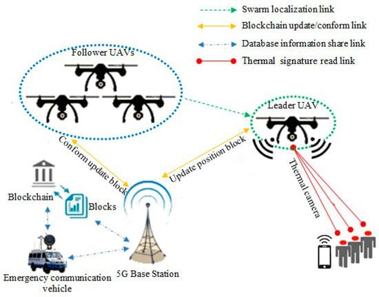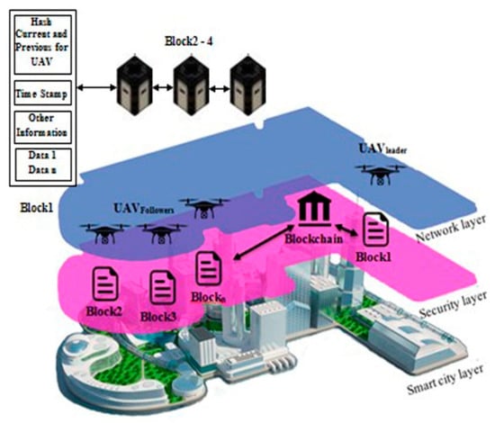 The simulated system consists of four UAVs configured as one leader-UAV and three follower-UAVs, as shown in Figure 4. Simulation software was written to handle the network using MATLAB simulator. The proposed software consists of two technologies, the first is SIL optimization, and the second is blockchain for each UAV. The information in UAV blocks changes every 10 s. Leader-UAV binds to follower-UAVs and sends hash information within the data block. All UAV blocks are following over the blockchain communication protocol. All UAVs float over the far region inside the emergency wireless network to conduct a signal-boosting mission. The UAV scheme was designed by merging the network layer and the blockchain layer, as illustrated in Figure 3 and below: