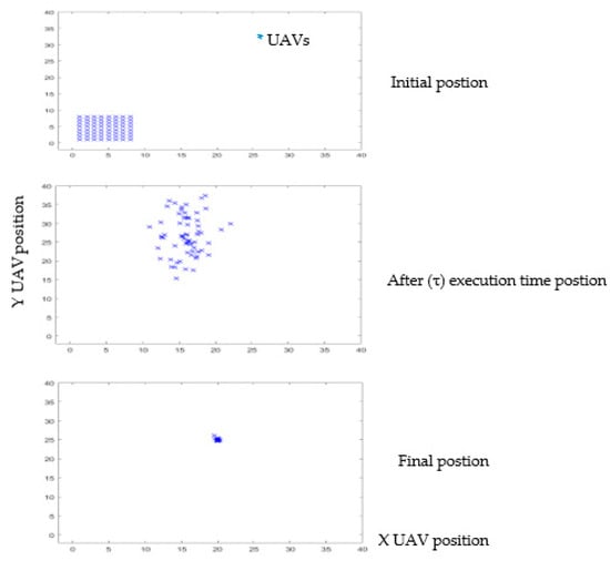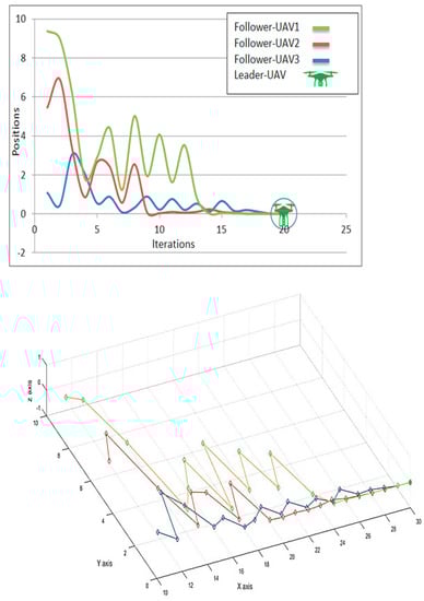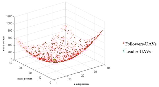 Three-dimensional MATLAB simulation diagram showing the result of directed follower-UAVs toward the leader-UAV location. The final result was estimated after 50 iterations.