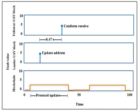According to the findings, using blockchain as a decentralized database in the Internet of Things applications will be beneficial in reducing time consumption. The Internet of Things relies on working with different devices, which need separate memory for each one that obeys the blockchain protocol. In reality, it is not easy for an attacker to attack all devices in the system individually, and there is no point in including malicious software in one of the device blocks, as the device is continuously upgrading data. As explained above, in the proposed model, blockchain synchronized interconnected blocks for the UAV network depend on the idea of updating and confirmation. Hence, the blocks communicate directly with each other without any third party. In general, each block contains two parts, the block header (hash list) for authentication and the block body (transaction) for data transmission [50], represented by the UAV location and the isolated region of the suggested proposal. As seen in Figure 8, the upgrade duration of the blockchain protocol is predetermined. In case the UAV detects a poor-signal zone, the UAV will change its data on its current position, and its condition will convert from a UAV to a leader-UAV. After 6.47 s, the remainder of the UAVs will confirm that they received the latest location. Then, follower-UAVs move to their expected location and aid by boosting the wireless signal in the target area. The blockchain performance analysis and storage are shown in Figure 9. The leader-UAV sends the location information as an encrypted block utilizing related and previous hashes to the decentralized database, wherein blockchain is used to communicate the location with follower-UAVs.
