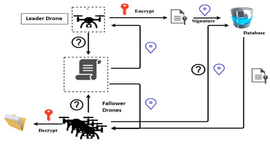 - Network layer: In the network layer, UAVs are divided into leader-UAV and follower-UAVs. In the case where a drone investigated and found a weak wireless signal, the drone becomes a leader-UAV and broadcasts its position in swarm space. Then, the leader-UAV interacts with other UAVs, who become follower-UAVs. During the contact, the follower-UAVs affirm reception of the location of the leader-UAV. At the same time, follower-UAVs coordinate with each other using the SIL swarm technique to travel into the weak signal zone. UAVs boost the signal region after the operation. A decentralization database is a secure connection database between UAV swarms.
