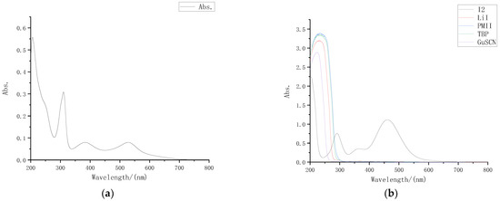 Preparation was carried out for 0.05 M I2 acetonitrile solution, 0.5 M LiI acetonitrile solution, 0.5 M TBP acetonitrile solution, 0.06 M GuSCN acetonitrile solution and 0.3 M PMII acetonitrile solution separately. After diluting different solutes 30 times with acetonitrile in proportion, we measured the ultraviolet visible absorption spectrum of each solute with an ultraviolet visible spectrometer, and the results are shown in Figure 2b.