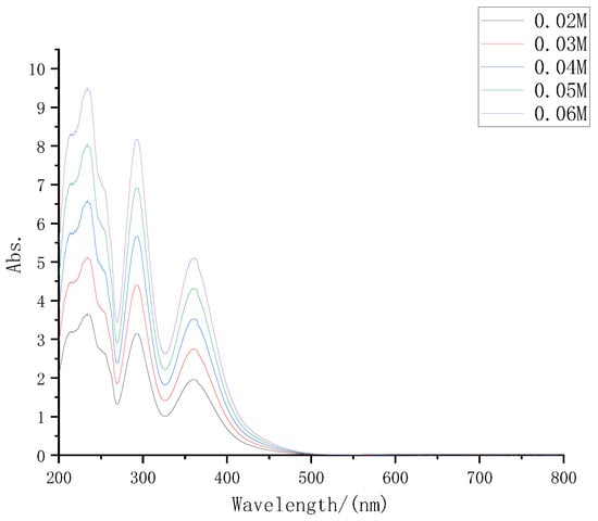 According to the electrolyte formula described in part 2, the electrolyte was prepared with iodine concentrations of 0.02 M, 0.03 M, 0.04 M, 0.05 M, and 0.06 M, respectively, diluted at 30 times at the same time, and then the UV-VIS spectrometer was used to test again. The UV-VIS absorption spectra of several electrolytes are shown in Figure 3.