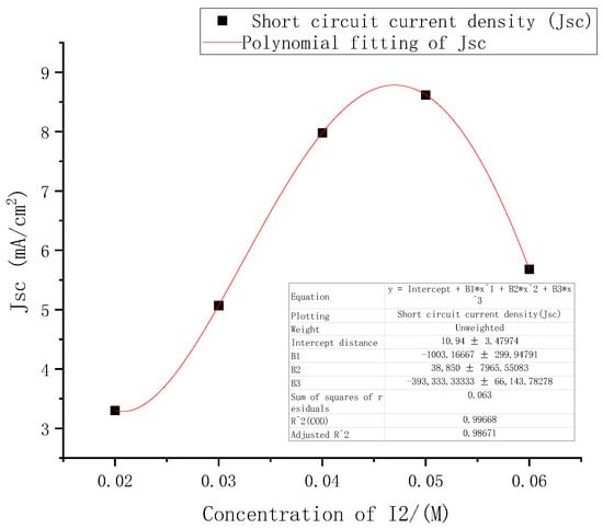 From the above performance changes in the DSSC under different electrolyte concentrations, among the three indicators of open circuit voltages, short-circuit current density, and filling factor, the most obvious change with concentrations was the short-circuit current density. The five points where the short-circuit current density changed with electrolyte concentrations were fitted in Origin software using third-order polynomial. The results are shown in Figure 8.