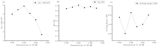 The short-circuit current density, open circuit voltage, and filling factor of electrolytes with different iodine concentration were measured. The results are shown in Figure 10.