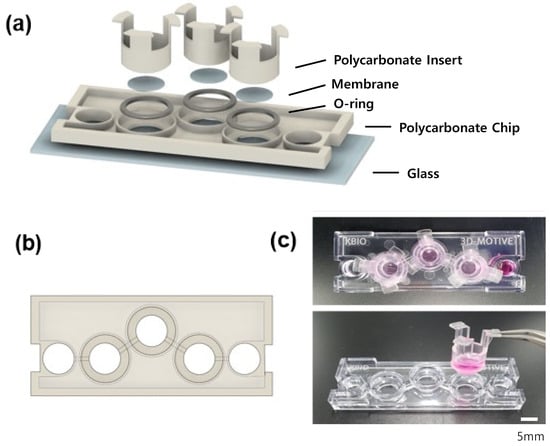 After an injection-molded PC layer is adhered to a glass using double-sided tapes (3M, Saint Paul, MN, USA), so as not to cause bubbles, an O-ring is sandwiched in a part where an insert is fitted. For the insert, EB-107LP-2 Part A and B (EpoxySet, Woonsocket, RI, USA) are mixed at a 100:35 ratio, and an epoxy adhesive is applied thinly to the insert before it hardens. This is followed by the application of membranes with a pore diameter of 0.4 μm or 3 μm (It4ip, Belgium, Louvain). After hardening the epoxy for one day so that the insert and membrane adhere, the epoxy was sterilized in an autoclave at 121 °C for 5 min.