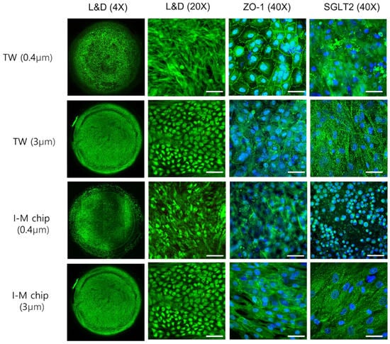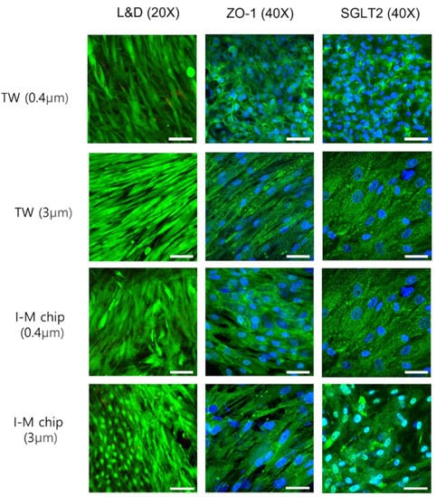 To attach cells to the membrane, the ECM was coated with collagen I. Before confirming whether the cells accurately represented the proximal renal tubule in insert-type chips, RPTEC and HUVEC were cultured in transwell (TW) and I-M chip for 14 days when the pore sizes were 0.4 μm and 3 μm, as depicted in Figure 2 and Figure 3. Green indicates LIVE cells in the L&D image. Overall, the cells were successfully attached to the membrane and cultivated well. Immunofluoresence observed SGLT2, which is responsible for transporting cell junction proteins and sodium-glucose transport proteins present in RPTEC.