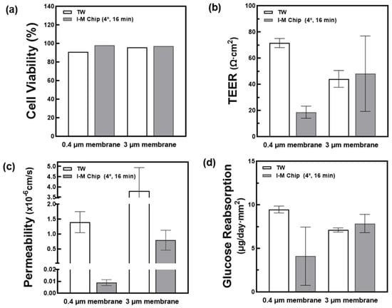 Cells were cultured using I-M chip and TW with 0.4 μm and 3 μm membrane pore diameters. Cell viability, TEER, permeability and glucose reabsorption were measured and compared. All TWs and chips were seeded under the same conditions. Cell viability measurements calculated the ratio of living to dead cells through ImageJ using photos taken in 20× during L&D shooting. When comparing cell viability, TW and I-M chip were cultivated well, and there was no significant difference, as shown in Figure 4a. TEER values were evaluated by comparing the difference in electrical resistance inside and outside the insert with one of the chopstick machines using Millicell ERS-2 Voltohmeters (Milipore, MA, USA). The TEER values in the chip with a 3 μm membrane tended to slightly increase compared to the TW (Figure 4b). Therefore, to check the barrier integrity, it is better to use a higher membrane pore size (3 μm). To reduce the errors that may occur during TEER measurement, the cell resistance value was measured using the same volume and temperature of the medium used and the absence of cells as the control. For permeability, FITC-dextran fluorescent dye was diluted to 0.5 mg/mL and treated in chambers at both ends of the chip. After the 6 h treatment time had elapsed, the solution secreted above the membrane was collected, and the fluorescence was measured to confirm the transmittance. To check the permeated concentration, the permeability was calculated using a standard curve. As shown in Figure 4c, the chip demonstrated lower fluorescence transmittance compared to the TW. When cultured on the chip, the cells spread more evenly, and the fluorescence transmittance is low. In addition, when 0.4 μm and 3 μm were compared, it was confirmed that more fluorescence was transmitted in the chip with a larger pore size.