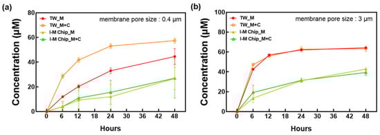 Therefore, as the role of the OCT2 transporter is important to reproduce the renal function, it is necessary to examine the transporter’s formation. To determine whether the secretion is carried out properly, the secretion ability of metformin and cimetidine was evaluated using HPLC. As shown in Figure 5, for the 0.4 μm membrane, the TW showed higher metformin concentration than the chip. Due to the large amount of metformin that permeated through the membrane, it was discovered that the cells on the chip were better cultured throughout the membrane. Conversely, cimetidine treatment increased the concentration in the TW, whereas the chip showed no significant difference. When metformin secretion at 3 μm was evaluated, the metformin concentration in the TW was comparable to that in the 0.4 μm membrane. Cimetidine showed an inhibition of metformin secretion when compared with 0.4 μm, but no significant inhibition was observed when compared to the effect of treatment with metformin alone under the same conditions.