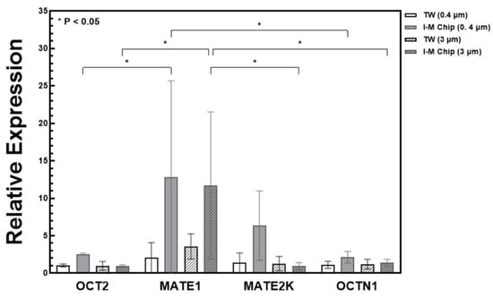 Quantitative PCR (qPCR) expression comparison results analysis. Relative expression levels of OCT2, MATE1, MATE2K, and OCTN1. Overall, it was shown that the gene expression level in chip was increased compared to transwell (* p < 0.05).