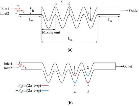 As shown in Figure 1, the schematic diagrams of a micromixer with a curved channel were proposed. To enhance the mixing performance of the micromixer, according to the convergent-divergent channel recently studied by Afzal et al. [], the profiles of the channel walls were depicted by cosine function based on: where: y, x are the longitudinal and axial coordinates of the function, and s is defined as the axial coordinates within 0 to 2 pi. Furthermore, the values of a and c are wavy amplitude and wavelength, respectively, for all models presented in Table 1, e is defined as the distance in one wavelength, and the value is set as 50 μm. For most two-dimensional (2D) micromixers, T-shape inlets are merged in the main microchannel. In this model, as shown in Figure 1a, the two inlets, inlet 1 and inlet 2, are joined to a straight channel with L length and connected with a cosine channel. The width b of the inlet channel and mixing unit N were defined here. The length of the exit channel was the same as the inlet channel with a constant L of 500 μm. Figure 1b presents the geometric structure of the proposed active micromixer. There are two pairs of electrodes at the bottom of the cosine channel wall. The longitudinal length of the applied electrodes was 72.42 μm with reference to the bottom of the microchannel. The red electrodes 1 and 3 show positive polarity, and the blue electrodes 2 and 4 show negative voltage polarity. The alternating electric field is loaded to generate chaotic flow to promote fluid mixing.