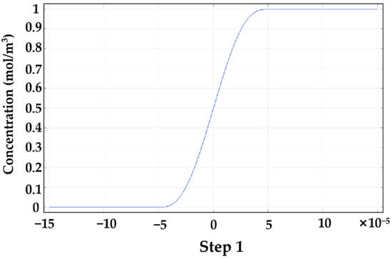 The step function was used to calculate the inlet concentration distribution, as shown in Figure 2. The concentration condition on inlet 1 and inlet 2 gives a sharp but smooth concentration gradient in the middle of the channel entrance. For the steady state, the molar concentration at inlet 1 and inlet 2 are set as follows: