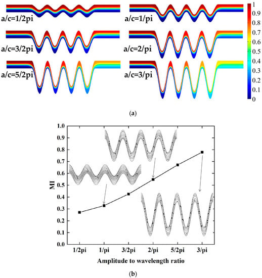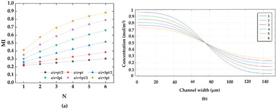 Figure 4a shows the concentration distribution along the x direction in all ratios of a/c under a steady state. It can be seen from Figure 4a that the fluid flow in the micromixer is completely laminar, and the fluid mixing behavior entirely depends on intermolecular diffusion. As can be seen from Figure 4b, the mixing efficiency improved qualitatively as the ratio of amplitude-to-wavelength increased. With a/c in the range of 1/2pi to 2/pi, the two fluid flow paths were almost parallel to each other, and there was no secondary flow. When a/c = 5/2pi and 3/pi, the mixing length was elongated. Two different fluids can be relatively fully mixed, and the mixing efficiency was significantly improved. Figure 4b shows the variation of the mixing index for the six a/c mixer configurations. The mixing efficiency is proportional to the a/c ratio. When a/c is 3/pi, that is, when the amplitude is 300 μm, mixing efficiency can be achieved at 78%. The concentration streamlines were added to the mixing index curve in Figure 4b, corresponding to a/c of 1/pi,2/pi, and 3/pi. With a low amplitude-to-wavelength ratio, fluid flow was close to the upper and lower cosinusoidal microchannel walls, and it was not enough to meet the requirements to generate a vortex. The fluid stay time increased with the ratio increase, and the centrifugal force near the top and bottom was larger than that at the center of the microchannel [,]. The fluid was thrown to the next mixing unit, and the mixing index became larger.