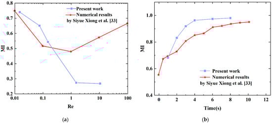 Model validation based on Siyue Xiong et al. [] (a) comparison of the mixing index for different Re numbers, (b) comparison of the mixing index for different voltages.