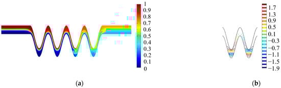 Simulation of the electroosmotic micromixer: (a) distribution of concentration surface along the micromixer, (b) electric potential streamlines when time t = 1 s, phase shift of pi/4, U0 = 0.1 mm/s, V0 = 2 V, f = 5 Hz.