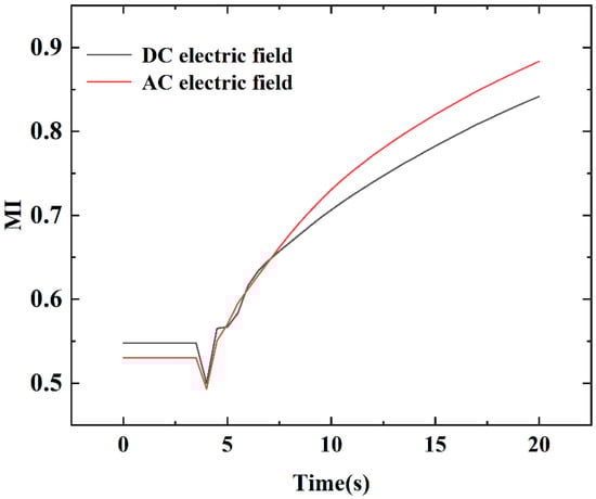 In this study, it can be seen from the above research that adjusting the main parameters of the micromixer structure, including the amplitude-to-wavelength ratio a/c and the mixing unit N, can play a role in obtaining a high mixing index of the proposed micromixer. However, under the appropriate microchannel structure parameters, such as the ratio of a/c of 2/pi and the value of b at 150 μm, the blending effect can only be at a medium level. Moreover, in the steady state, when the number of mixing units is at six, a better mixing effect can be achieved in all cases. Assuming that external energy is added to become an electroosmotic flow active micromixer, the mixing index will have a chance to improve further under the above cases. To shorten the mixing channel length while increasing the mixing efficiency, the number of mixing units is kept at four. The flow field, concentration field, and electric field of the electroosmotic micromixer can be calculated according to the governing equations given in (Section 3.3). In this part of the simulation, as shown in Figure 2, the values of amplitude-to-wavelength ratio (a/c) and channel width (b) were 2/pi and 150 μm, respectively, which were fixed at appropriate values. Concentration profiles in Figure 7a present that when an AC electric field is applied, the vortices are generated primarily in the environs of the electrodes, which develop into waves within the side wall of the cosine microchannel and continue to the straight microchannel. As shown in Figure 7b, a relatively uniform electric intensity is formed. To assess the mixing efficiency of the present electroosmotic micromixer, a comparison of time-dependent variations of both AC and DC electric fields was presented in Figure 8. As can be seen from Figure 8, AC electroosmosis has a better induction effect than DC electroosmosis.