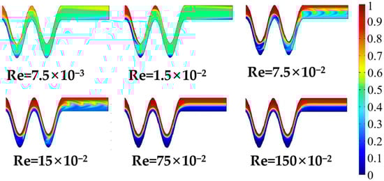 In the present study, in order to further describe fluid flow characteristics within the micromixer, the Reynolds number should be further studied to understand the fluid flow phenomenon. Figure 9 presents concentration distribution profiles from the A-A section to the outlet of the electroosmotic micromixer under six different Reynolds numbers ranging from 7.5 × 10−3 to 150 × 10−2. The Re number of 1.5 × 10−2 corresponds to the inlet velocity of 0.1 mm/s. The fluid mixing becomes more uniform related to Reynolds numbers of 7.5 × 10−3, 1.5 × 10−2 correspondingly to the inlet velocity of 0.05 mm/s and 0.1 mm/s, respectively. With Reynolds numbers increasing to 7.5 × 10−2 and 15 × 10−2, the fluid distribution is plug-like and continues to the channel outlet. When the Reynolds number is larger than 15 × 10−2, the fluid concentration basically does not change and shows basic lateral flow. It can be seen from the results that the mixing quality at the outlet of the micromixer decreases as the Re numbers increase. This is due to the dominance of electroosmotic force at low velocities, and the mixing time is extended, leading to increased mixing quality. However, as the Reynolds number increases, the eddy generated by the electroosmotic force cannot effectively induce fluid mixing, and the laminar flow plays a major role at this time. As seen in Figure 10, the mixing efficiency of the proposed micromixers with steady and transient states was compared. In order to further investigate the influence of the Reynolds inlet on the mixing performance, numerical simulations of the micromixer at different amplitude-to-wavelength ratios of each case were carried out. It is easy to know that smaller inlet velocity shows a better blending effect in all cases. By comparing Figure 10a,b, the mixing index of the electroosmotic micromixer in the transient state exceeds that of the passive micromixer in the steady state. At a steady state, the increase in flow velocity makes laminar diffusion weaker, resulting in the reduction of the mixing quality. The fluid direction changes due to the alternating electric field. A Reynolds number of 7.5 × 10−3 and an inlet velocity of 0.05 mm/s produced a mixing efficiency of 77%, while the mixing index for a Reynolds number of 1.5 × 10−2 is reduced by 22% compared with 7.5 × 10−3. It can be concluded that the mixing quality can be effectively improved by reducing the inlet velocity.