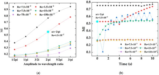 Variations of the mixing index at the outlet of the passive micromixer and the electroosmotic micromixer with different Reynolds numbers: (a) the mixing index of the passive micromixer of six amplitude of wavelength ratios, (b) the mixing index of the electroosmotic micromixer within 0–10 s.
