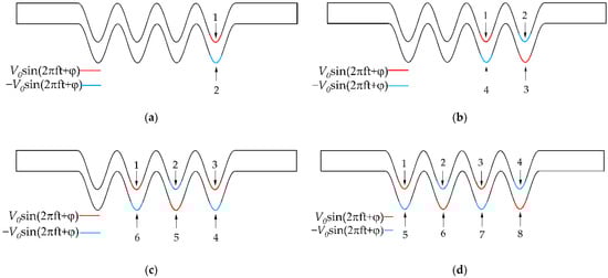 Distributions of electrode pairs positions: (a) one pair, (b) two pairs, (c) three pairs, (d) four pairs.