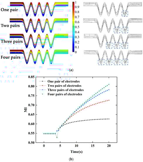 Next, based on the previous simulation conclusions, it is supposed that applying multiple electrode pairs on the proposed micromixer has an effect on the mixing efficiency. Figure 11 shows the positions of the different electrode pairs. Previously, two pairs of electrodes were set up. Based on the physical model in Figure 2, under the same conditions, four pairs of electrodes were set up. The alternating electric field voltage amplitude value and frequency were also kept at 2 V and 5 Hz. Figure 12a shows the concentration profiles of microchannels with four electrode pairs at t = 20 s, respectively. It can be seen from Figure 12 that when the electrode pairs were applied, the fluid concentration distribution at the bottom of the channel changed significantly, while there was no obvious mixing behavior at the wall of straight channels and cosine microchannels away from the electrodes. As the number of electrode pairs increased, the fluids formed a vortex near the electrode, causing the fluids to be stretched and folded repeatedly. The fluid mixing contact area increased, and the mixing effect was considerable. The concentration streamlines for different pairs of electrodes in Figure 12a have been presented. It can be observed that the electric field had a significant impact on fluid mixing throughout the micromixer. As depicted in Figure 12b, the results show that when a pair of electrodes is applied, the mixing efficiency can reach 62% at t = 20 s, while more pairs of electrodes on the microchannel lead to a small increment of the mixing efficiency. The rotating vortex at this time weakens the mixing effect of the fluids, which is caused by the mutual influence of adjacent electrode pairs on the fluid disturbance in the microchannel. When four pairs of electrodes are applied, the mixing efficiency reaches 82%, which is a 10% increase over when two pairs of electrodes are applied.