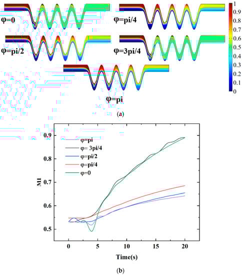 Besides, the effect of phase shift on mixing efficiency has been carried out. In this part, the 1, 3, 5, and 7 boundaries of the micromixer in Figure 11d are set as ground, that is, zero potential. The 2, 4, 6, and 8 boundaries are set as periodic potentials with the opposite polarity of adjacent electrodes. Moreover, the potential function of boundary 2 is kept as the initial phase so that its phase shift with other potential functions is 0, pi/4, pi/2, 3pi/4, and pi, respectively. As shown in Figure 13a, different phase shifts were tried. Four pairs of electrodes were used. It can be seen from Figure 13 that when the phase shift of the potential function at the bottom side is changed, the mixing efficiency at the outlet changes. When the phase shift is 0 and 3pi/4, the effect of electroosmosis and external electric field on the fluid mixing is relatively stronger. An obvious mixing efficiency larger than 90% can be achieved. When the phase shift of pi/4, pi/2, and pi, the internal disturbance of the fluid under the action of the vortex was strengthened so that the mixing effect was enhanced. When the phase shift is pi/4, the size of the fluid vortex increases starting from the first mixing cycle unit, and the highly concentrated fluid layer stretches outward for effective mixing. Figure 13b shows the mixing efficiency within t = 20 s for different phase shifts. As expected, in the range of 0 to pi phase shift, the electroosmotic and external electric field driving forces generated by varying the phase shifts are proportional to the mixing index. The phase shift of 3pi/4 obtains the best mixing for a short time with respect to a mixing index of 90.3%. It can be seen from Figure 13b that the mixing can be effectively induced by adjusting the phase shift.