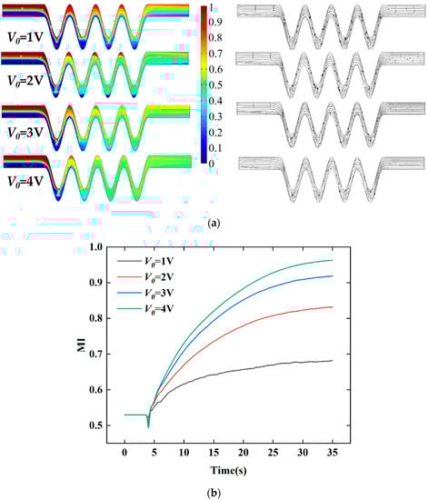 Next, in order to further study the effect of applying electroosmotic flow and AC electric field on the micromixer, different voltages in the range of 1–4 V were investigated to find its motion of the effect on the fluid mixing behavior. In this part, no phase shift was set to explore the effect of voltage on mixing properties. Figure 14a,b present the behavior of the fluid flow in the electroosmotic micromixer in eight cases. The frequency and the mean velocity were kept at 5 Hz and 0.1 mm/s, respectively. As shown in Figure 14a, the mixing index was developed with increased electric voltages. When the voltage was high, the vortex transported the highly concentrated fluid backward, blurring the boundaries between the fluids and getting well mixed. The vortex produced by the electroosmotic flow squeezed the high-concentration fluid downward, significantly improving the mixing quality. The streamline diagrams on the right of Figure 14a show that several pairs of symmetrical vortices were formed near the electrodes at the bottom of the microchannel, and the fluid streamlines were stretched in opposite directions. Moreover, the influence of the fluid vortex gradually expanded as the voltage increased, presenting a fold and stretch motion. The mixing efficiency for different voltages applied on the electroosmotic micromixer is quantitatively compared. When the voltage of V0 = 2 V, the mixing quality can reach 83%. When beyond the value of the electric voltage of V0 = 3 V, the mixing degree at the outlet of the micromixer can be greatly mixed. Subsequently, the mixing efficiency gradually tends to be stable.