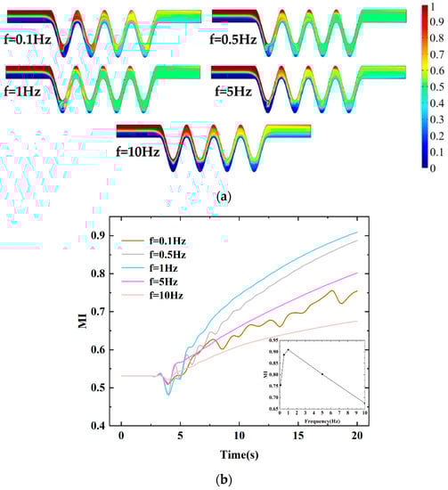 In addition to the above factors affecting mixing efficiency, different AC frequencies were also investigated from 0.1 Hz to 10 Hz to study which frequency would achieve suitable mixing quality. Figure 15 shows the concentration distribution of the proposed micromixer with five frequencies to study the effect of frequencies on the mixing quality. The results show that the mixing index increased when the frequency increased from 0.1 Hz to 0.5 Hz and then decreased when the value was from 1 Hz to 10 Hz. It is worth noting that when the frequency increased, the mixing efficiency did not increase as we would expect. It can be seen from Figure 15a that the concentrations can be uniformly distributed, which indicates that the fluids achieve good mixing. When the frequency was increased to f = 5 Hz and f = 10 Hz, the mixing effect was not ideal. When the applied frequency was 10 Hz, the two fluids rotated near the electrodes. From Figure 15b, it can be demonstrated that an optimal mixing index of 91% is obtained when f = 1 Hz. Figure 15b also extracts the mixing efficiency at the outlet when the mixture reaches a relatively stable state. Generally, at low frequencies, there is an optimal frequency contributing to the maximum mixing efficiency. This is because there is insufficient time to respond and make the electroosmotic flow create rotating vortices under high frequency, corresponding to a smaller period [,,]. This may contribute to the change of positive and negative polarity of electrodes when the electric field changes faster with the increase of the frequency.