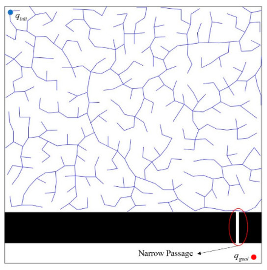 Figure 1, the probability of RRT generating waypoints in the narrow passage is reduced since the area of the narrow passage is small. If no waypoints are generated in a narrow passage, RRT cannot find a path through it. Some research [