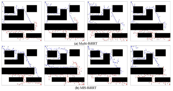 Figure 11 illustrates the four path-growing processes of Multi-BiRRT and MIS-BiRRT in Map 6. We can see that the shapes of the path trees grown by the Multi-BiRRT method are very similar. Sampling schemes with importance functions represent a trade-off between degeneracy and impoverishment [