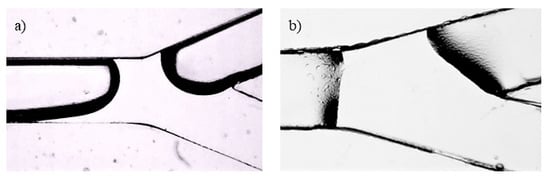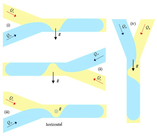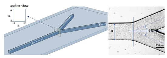 - He, P.; Barthès-Biesel, D.; Leclerc, E. Flow of Two Immiscible Liquids with Low Viscosity in y Shaped Microfluidic Systems: Effect of Geometry. Microfluid. Nanofluid. 2010, 9, 293–301. [Google Scholar] [CrossRef]
