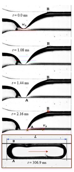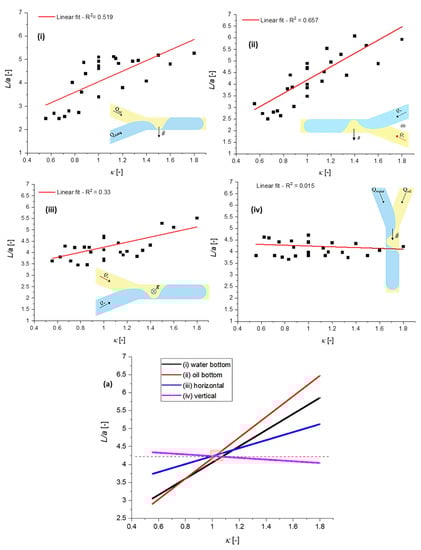 - Gravity has a relevant influence on dependence, the length increasing with ; the slope against was almost zero for the vertical position, the highest value being observed in case (ii), shown in Figure 8, i.e., a less dense liquid at the bottom;