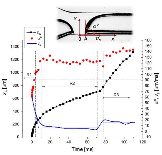 - R3. Slide increase in contact angle and small oscillations in slip velocity. At the end of the R3 regime, the droplet interface reaches the steady state, i.e., the plug flow.