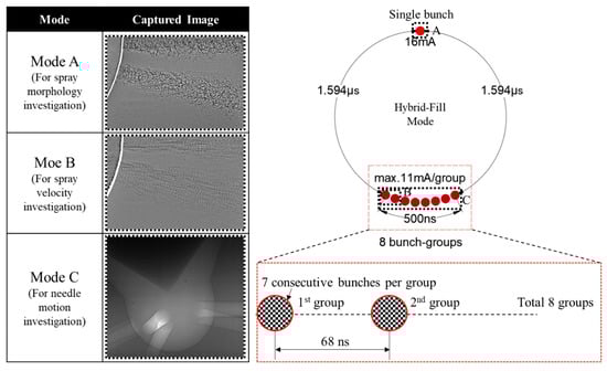 Eight consecutive bunch groups, i.e., mode C, were used to get a bright image of needle motion inside the injector. To use different imaging modes, the pulse timing of the X-ray must be known. An imaging scan was done by shifting the camera shutter timing stepwise. Then, the pulse timing was known according to the intensity change in the sequence of images. Once the pulse timing was specified, different imaging purposes could be easily shifted using a digital delay generator.